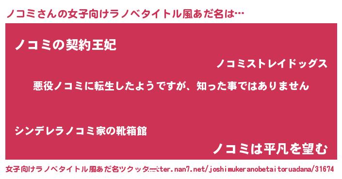 | 胡散臭い通販商品みたいなあだ名 | 『あなたにだけ特別に提供する100年もののヴィンテージワイン…その名も「ノコミ」』 |