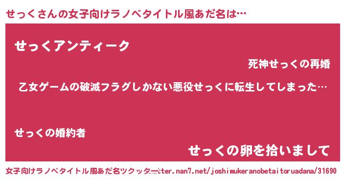 | 男性向けラノベタイトル風あだ名 | 『この素晴らしい世界にせっくを!』 |