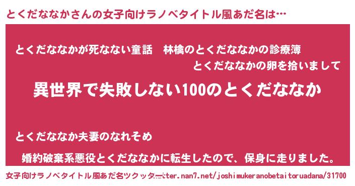 | 男性向けラノベタイトル風あだ名 | 『とくだななかという概念が存在しない退屈な世界 』 |