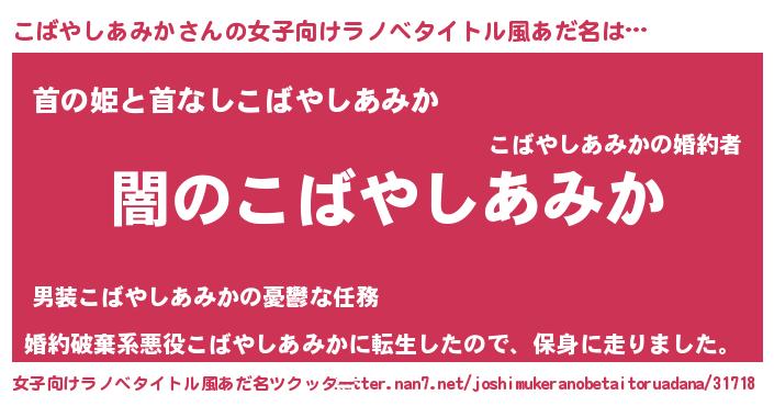 | 男性向けラノベタイトル風あだ名 | 『Re:こばやしあみかから始める異世界生活』 |