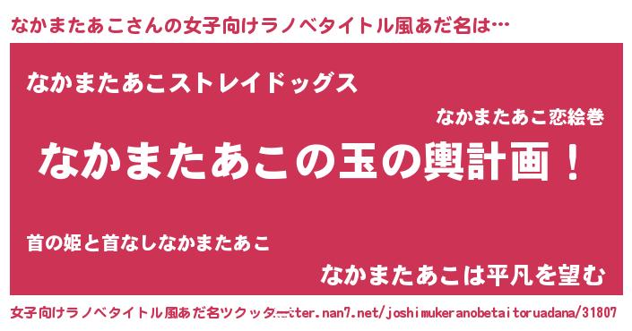 | 男性向けラノベタイトル風あだ名 | 『なかまたあこ~年齢イコール彼女いない歴の魔法使い~』 |