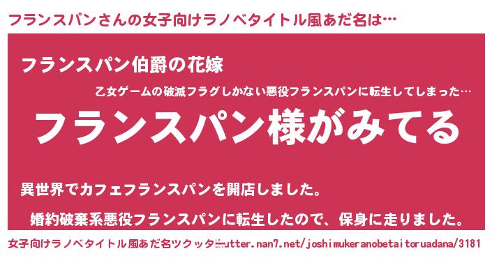 | 男性向けラノベタイトル風あだ名 | 『フランスパンの嫁は女の子じゃないと思った?』 |