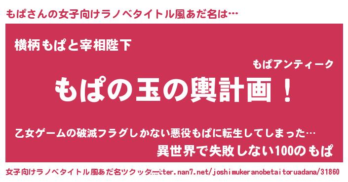 | 男性向けラノベタイトル風あだ名 | 『もぱ~年齢イコール彼女いない歴の魔法使い~』 |