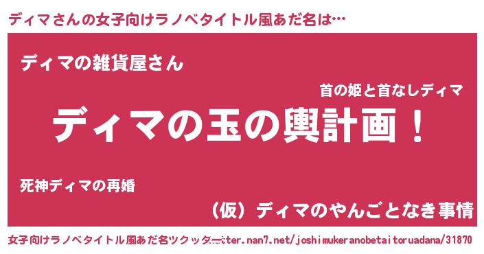 | 男性向けラノベタイトル風あだ名 | 『転生したらディマだった件』 |