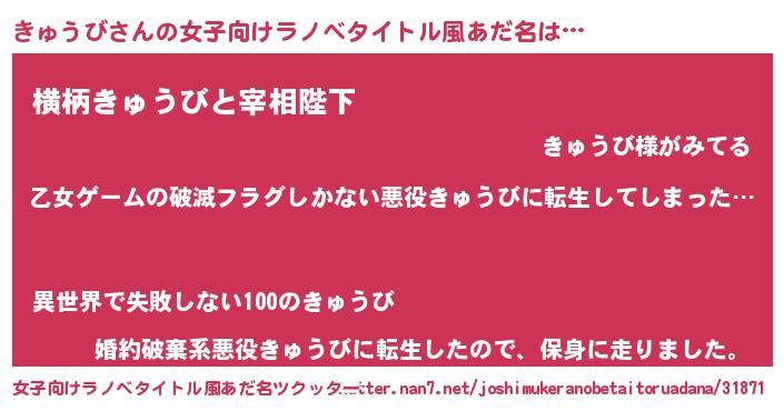 | 男性向けラノベタイトル風あだ名 | 『魔弾の王ときゅうび』 |