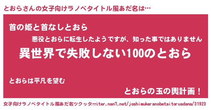 | 男性向けラノベタイトル風あだ名 | 『とおらという概念が存在しない退屈な世界 』 |