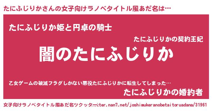 たにふじりかさんの女子向けラノベタイトル風あだ名は… 『闇のたにふじりか』『たにふじりか姫と円卓の騎士』『たにふじりかの婚約者』 ツクッター #女子向けラノベタイトル風あだ名ツクッター http://tkutter.nan7.net/joshimukeranobetaitoruadana/31961/