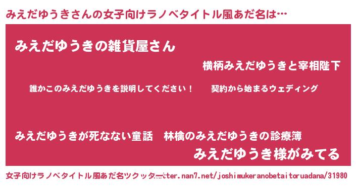| 男性向けラノベタイトル風あだ名 | 『ミエダユウキアートオンライン』 |