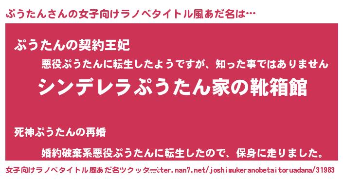 | 男性向けラノベタイトル風あだ名 | 『緋弾のプウタン』『プウタンスレイヤー』 |