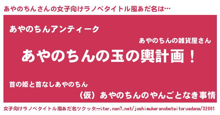 あやのちんさんの女子向けラノベタイトル風あだ名は… 『あやのちんの玉の輿計画!』『あやのちんアンティーク』『(仮)あやのちんのやんごとなき事情』 ツクッター #女子向けラノベタイトル風あだ名ツクッター http://tkutter.nan7.net/joshimukeranobetaitoruadana/32001/