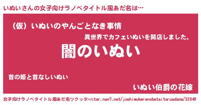 いぬいさんの女子向けラノベタイトル風あだ名は… 『闇のいぬい』『(仮)いぬいのやんごとなき事情』『いぬい伯爵の花嫁』 ツクッター #女子向けラノベタイトル風あだ名ツクッター http://tkutter.nan7.net/joshimukeranobetaitoruadana/32049/