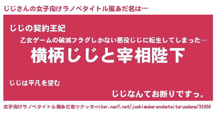 | 男性向けラノベタイトル風あだ名 | 『じじに滅ぼされるだけの簡単なお仕事です』 |