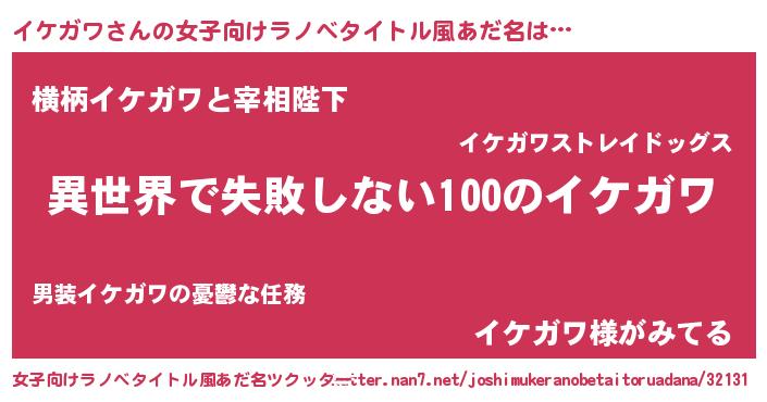 | 男性向けラノベタイトル風あだ名 | 『イケガワという概念が存在しない退屈な世界 』 |