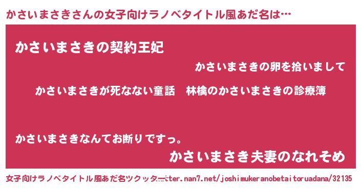 かさいまさきさんの女子向けラノベタイトル風あだ名は… 『かさいまさきが死なない童話 林檎のかさいまさきの診療簿』『かさいまさきの契約王妃』『かさいまさき夫妻のなれそめ』 ツクッター #女子向けラノベタイトル風あだ名ツクッター http://tkutter.nan7.net/joshimukeranobetaitoruadana/32135/