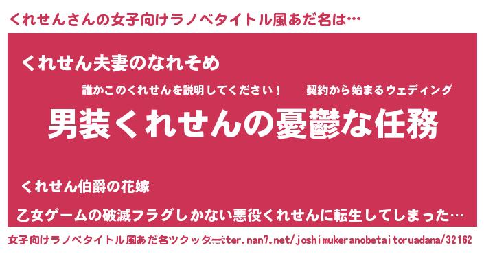| 男性向けラノベタイトル風あだ名 | 『うちのくれせんが世界を掌握している!』 |