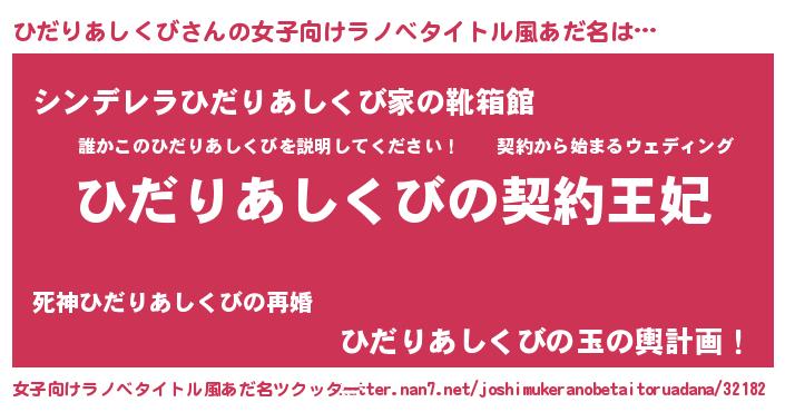 | 男性向けラノベタイトル風あだ名 | 『ひだりあしくびという概念が存在しない退屈な世界 』 |