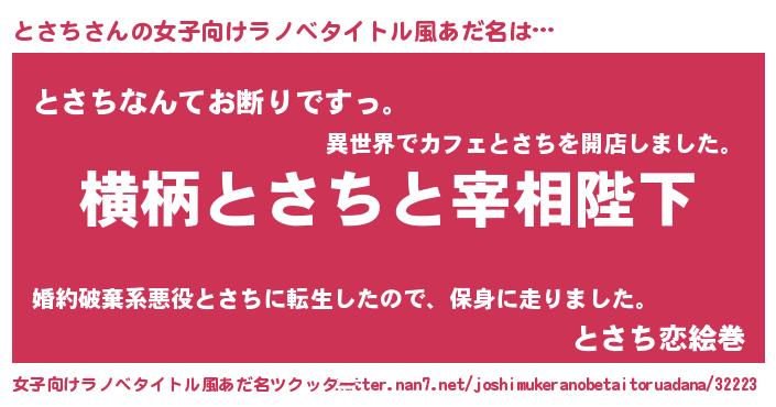 | 男性向けラノベタイトル風あだ名 | 『とさちに滅ぼされるだけの簡単なお仕事です』 |