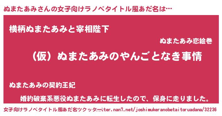| 男性向けラノベタイトル風あだ名 | 『ぬまたあみの憂鬱』 |