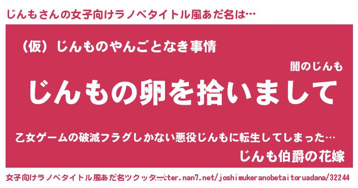 | 男性向けラノベタイトル風あだ名 | 『じんもの嫁は女の子じゃないと思った?』 |