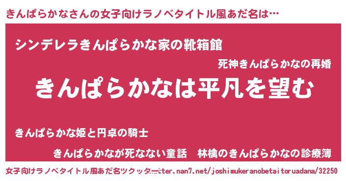 | 胡散臭い通販商品みたいなあだ名 | 『信頼と実績のサプリメント…その名も「きんぱらかな」』 |