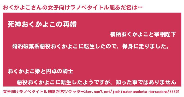 | 男性向けラノベタイトル風あだ名 | 『転生したらおくかよこだった件』 |