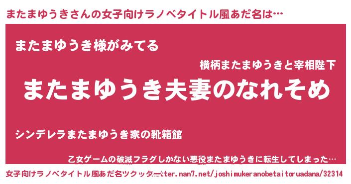 | 男性向けラノベタイトル風あだ名 | 『おまえをオタクにしてやるから、俺をまたまゆうきにしてくれ! 』 |