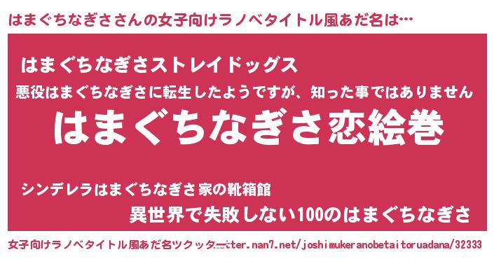 | 男性向けラノベタイトル風あだ名 | 『おまえをオタクにしてやるから、俺をはまぐちなぎさにしてくれ! 』 |