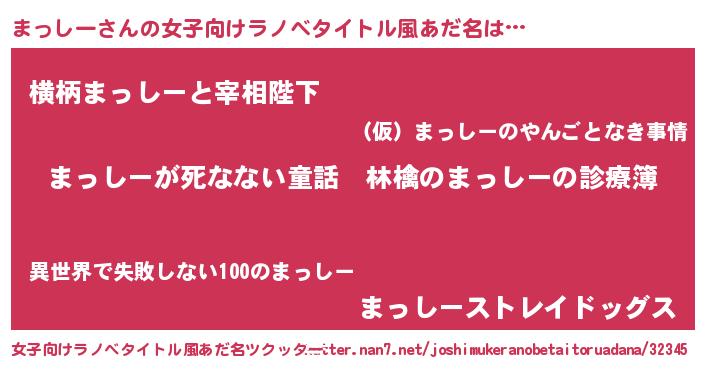 | 男性向けラノベタイトル風あだ名 | 『魔弾の王とまっしー』『まっしーの憂鬱』 |