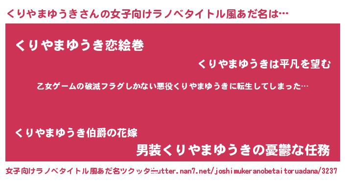 | 男性向けラノベタイトル風あだ名 | 『この素晴らしい世界にくりやまゆうきを!』 |