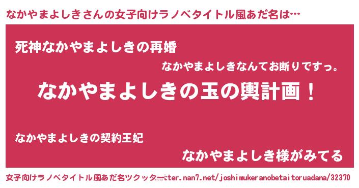 | 男性向けラノベタイトル風あだ名 | 『なかやまよしき~年齢イコール彼女いない歴の魔法使い~』 |