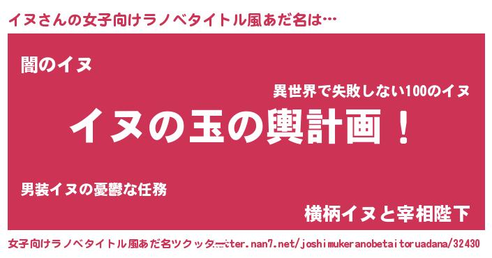 | 男性向けラノベタイトル風あだ名 | 『イヌ~年齢イコール彼女いない歴の魔法使い~』 |