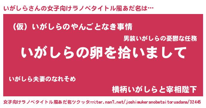 | 男性向けラノベタイトル風あだ名 | 『いがしらの嫁は女の子じゃないと思った?』 |