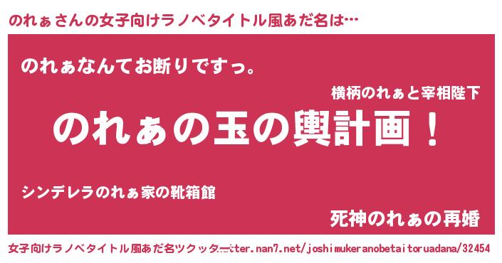 | 男性向けラノベタイトル風あだ名 | 『のれぁ~年齢イコール彼女いない歴の魔法使い~』 |