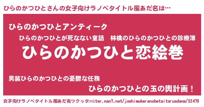 | 男性向けラノベタイトル風あだ名 | 『ノーゲーム・ノーヒラノカツヒト』 |