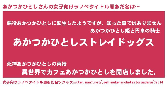 | 男性向けラノベタイトル風あだ名 | 『Re:あかつかひとしから始める異世界生活』 |