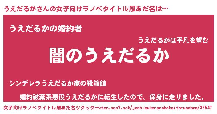 | 男性向けラノベタイトル風あだ名 | 『Re:うえだるかから始める異世界生活』 |