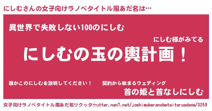 | 男性向けラノベタイトル風あだ名 | 『にしむ~年齢イコール彼女いない歴の魔法使い~』 |