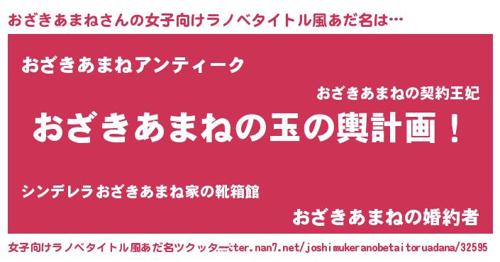 | 男性向けラノベタイトル風あだ名 | 『おざきあまね~年齢イコール彼女いない歴の魔法使い~』 |