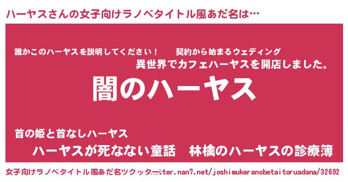 | 男性向けラノベタイトル風あだ名 | 『Re:ハーヤスから始める異世界生活』 |