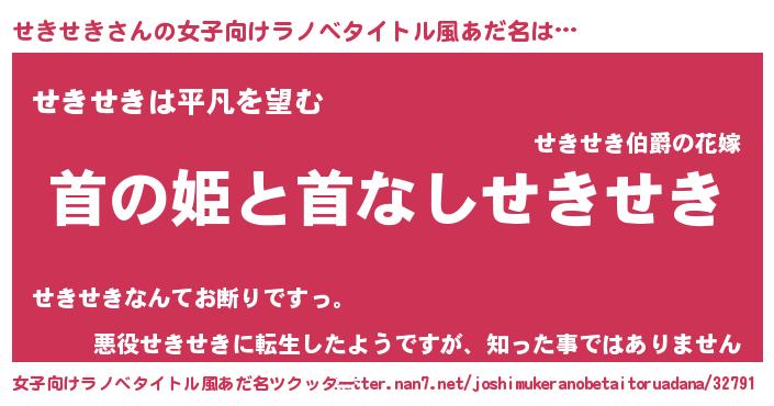 せきせきさんの女子向けラノベタイトル風あだ名は… 『首の姫と首なしせきせき』『せきせきは平凡を望む』『悪役せきせきに転生したようですが、知った事ではありません』 ツクッター #女子向けラノベタイトル風あだ名ツクッター http://tkutter.nan7.net/joshimukeranobetaitoruadana/32791/