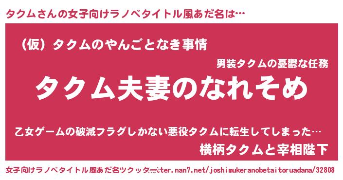 | 男性向けラノベタイトル風あだ名 | 『おまえをオタクにしてやるから、俺をタクムにしてくれ! 』 |