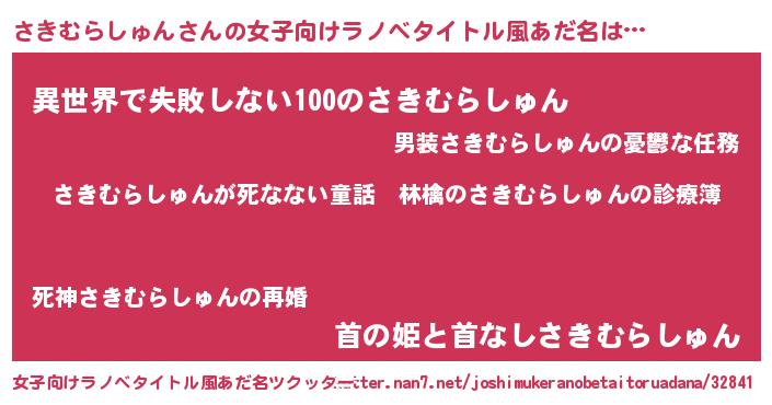 | 男性向けラノベタイトル風あだ名 | 『魔弾の王とさきむらしゅん』 |