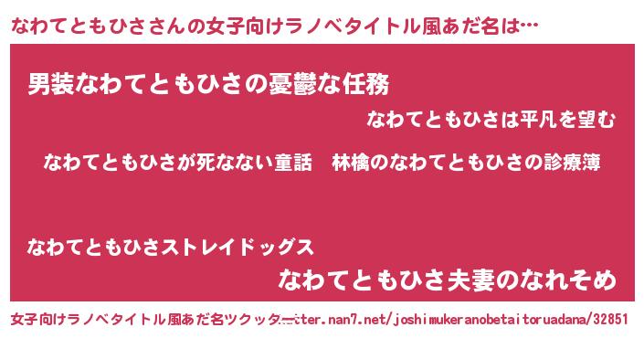 | 胡散臭い通販商品みたいなあだ名 | 『ハリウッド女優が絶賛した世界で10本だけ現存している希少なブランデー…その名も「なわてともひさ」』 |