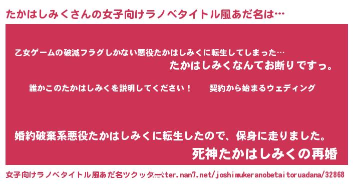 | 男性向けラノベタイトル風あだ名 | 『タカハシミクアートオンライン』 |