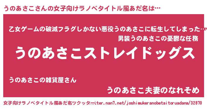 | 男性向けラノベタイトル風あだ名 | 『Re:うのあさこから始める異世界生活』 |