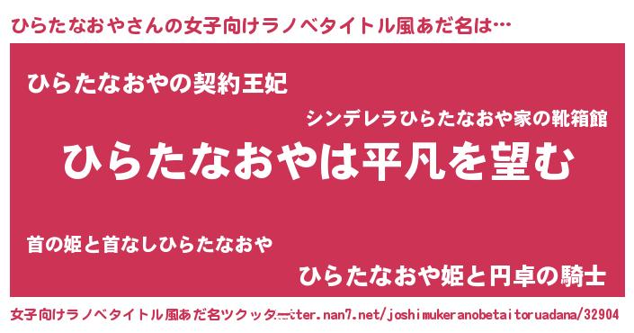 ひらたなおやさんの女子向けラノベタイトル風あだ名は… 『ひらたなおやは平凡を望む』『ひらたなおやの契約王妃』『ひらたなおや姫と円卓の騎士』 ツクッター #女子向けラノベタイトル風あだ名ツクッター http://tkutter.nan7.net/joshimukeranobetaitoruadana/32904/