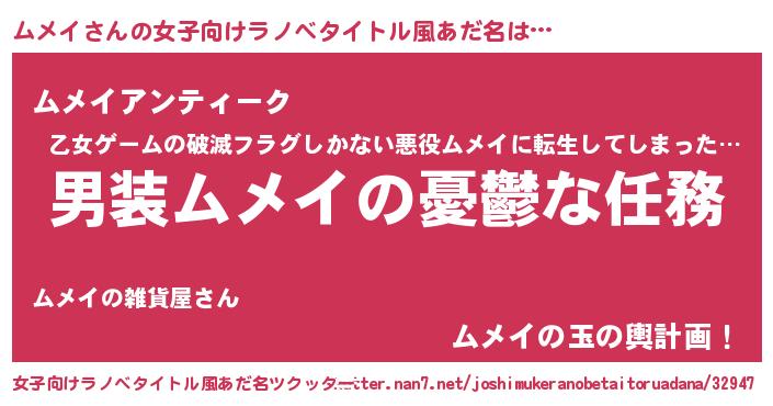 | 男性向けラノベタイトル風あだ名 | 『冴えないムメイの育てかた』 |