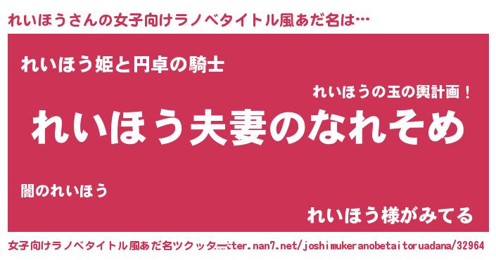 れいほうさんの女子向けラノベタイトル風あだ名は… 『れいほう夫妻のなれそめ』『れいほう姫と円卓の騎士』『れいほう様がみてる』 ツクッター #女子向けラノベタイトル風あだ名ツクッター http://tkutter.nan7.net/joshimukeranobetaitoruadana/32964/