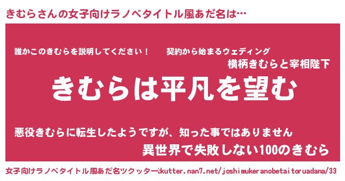 きむらさんの女子向けラノベタイトル風あだ名は… 『きむらは平凡を望む』『誰かこのきむらを説明してください! ~契約から始まるウェディング~』『異世界で失敗しない100のきむら』 ツクッター #女子向けラノベタイトル風あだ名ツクッター http://tkutter.nan7.net/joshimukeranobetaitoruadana/33/