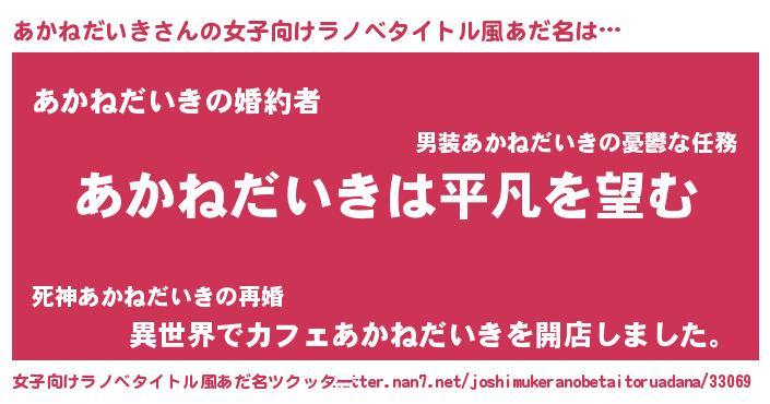 | 男性向けラノベタイトル風あだ名 | 『ダンジョンにあかねだいきを求めるのは間違っているだろうか』 |